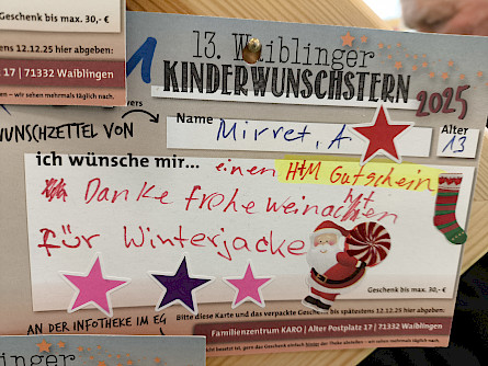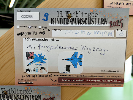 Rund 350 Kinderwünsche hängen in diesem Jahr wieder am großen Holzstern – jeder einzelne ein Herzenswunsch eines Kindes, das unter schwierigen sozialen oder wirtschaftlichen Bedingungen aufwächst. Und jedes „Pflücken“ zeigt, was Waiblingen ausmacht: hinschauen, füreinander da sein und Freude schenken.