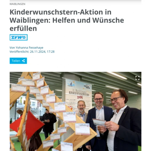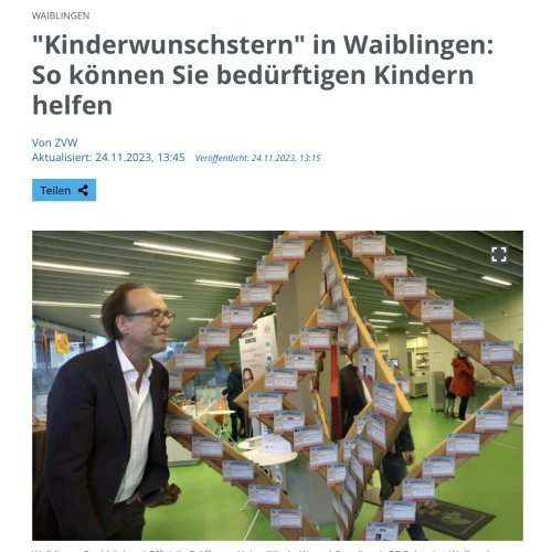 bringen. Die Not ist groß, und umso wichtiger ist es, dass wir als Gemeinschaft zusammenzuhalten und einander unterstützen. Der KinderWunschStern ist eine wunderbare Möglichkeit, Herzenswünsche wahr werden zu lassen und ein kleines Licht der Freude in das Leben der Kinder zu bringen“, erklärt Christoph Sonntag, Gründer der Stiphtung Christoph Sonntag. „Ich lade alle Waiblinger Bürgerinnen und Bürger ein, sich an dieser wunderbaren Aktion zu beteiligen.“