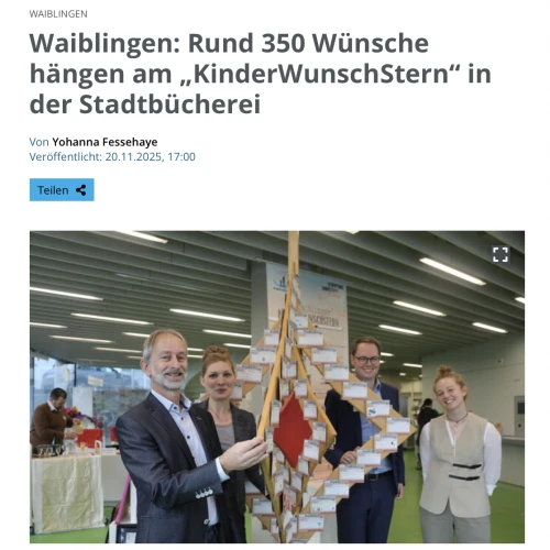 Vom 20.11. bis 7.12.2025 steht der „KinderWunschStern“ geschmückt in der Stadtbibliothek Waiblingen und die Waiblinger Bürgerinnen und Bürger können die Wunschkarten abnehmen. Die Bibliothek ist an folgenden Tagen geöffnet:
