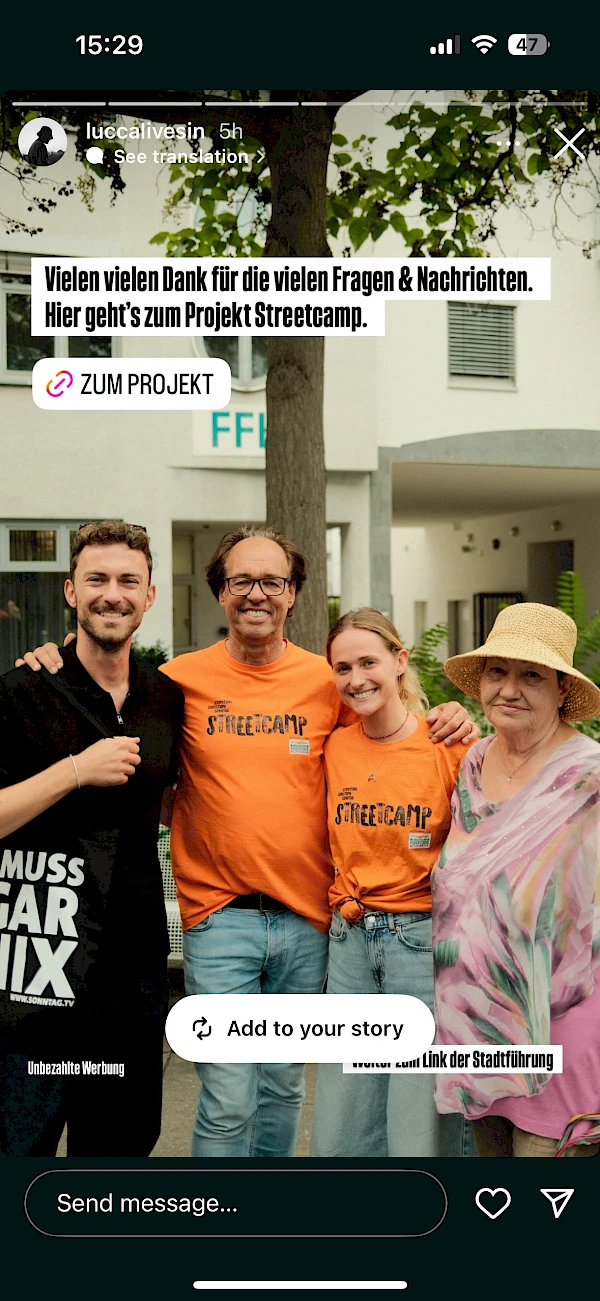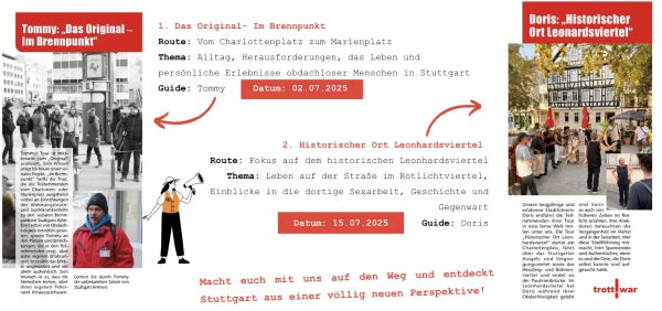 Mit den StreetCamp-Alternativen Stadtführungen bieten wir eine besondere Perspektive auf Stuttgart – erzählt von Menschen, die das Leben auf der Straße oder in prekären Verhältnissen selbst erlebt haben. Unsere Führungen ermöglichen Begegnungen auf Augenhöhe, fördern den Austausch zwischen unterschiedlichen gesellschaftlichen Gruppen und schaffen ein tieferes Verständnis für das Leben jenseits von Wohlstand und Komfort.